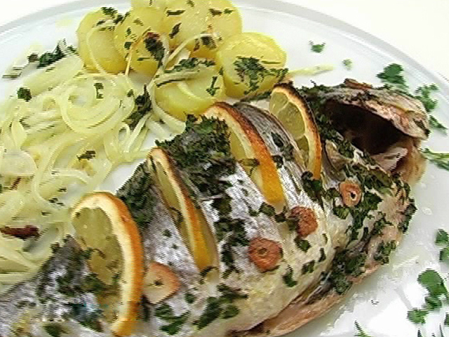 Простое, но очень вкусное блюдо.Состав:дорада — 1 штука;розмарин — 1 веточка;картофель — 200 гр;чеснок — 1 зубчик;петрушка — 1 пучок;лук — 1/2 штуки;лимон — 5 долек;немного оливкового масла. Язык: Русский