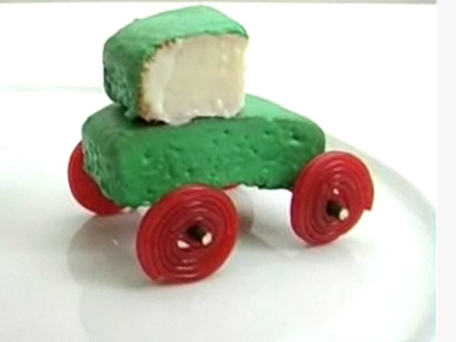 Забавный десерт из бисквитов.Состав:бисквитное пирожное — 3 штуки;яйцо — 1 штука;шоколадные палочки — 4 штуки;лакрица, сахарная пудра, красный краситель, зеленый краситель. Язык: Русский