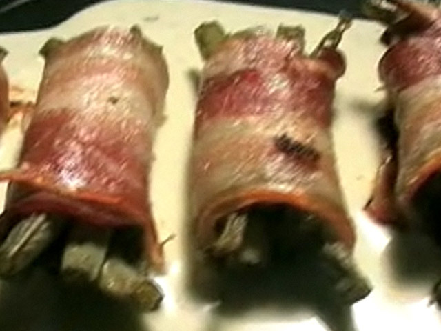 Вкусная закуска из бекона и сыра.Состав:бекон — 3 кусочка;сыр — 100 гр;сливки — 1 стакан;масло, фасоль. Язык: Русский