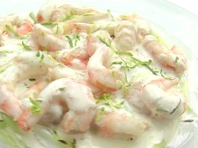 Закуска из креветок в дополнении с лаймовым соусом.Состав:креветки — 30 штук;огурец — 1 штука;лайм — 1 штука;йогурт, майонез — по 1 порции;сок лайма, белый перец, соль, тмин. Язык: Русский