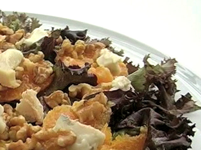 Салат с апельсином и сыром.Состав:грецкие орехи — 50 гр;апельсин — 1 штука;лолло россо — 1 качан;сыр горгонзо — 1 кусочек;оливковое масло, травяная соль, лимонный сок, мед. Язык: Русский
